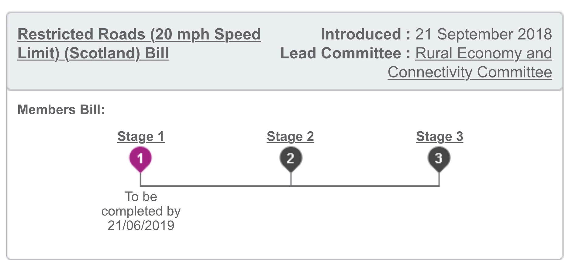 An interesting example of a Bill encountering difficulties in the Scottish Parliament is the Restricted Roads (20 mph Speed Limit) (Scotland) Bill which was introduced by Green Party MSP, Mark Ruskell on 21 September 2018.